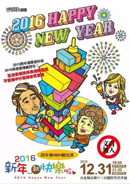 超强卡司郭子乾、夏靖庭、吕曼茵主演打造的另类跨年趴,曾在2015跨年场票房秒杀,2016再度以剧场疯跨年!带大家在剧场烟火中High炸,用创意节目回顾台湾本年度的精华,文青千万小心,怪咖欢迎光临!